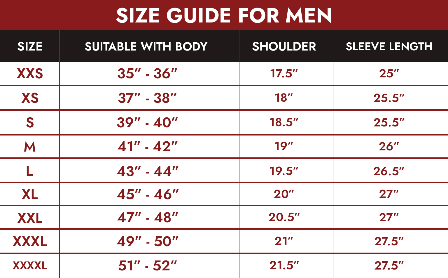 Count your sleeve length by measuring from the shoulder end to your wrist for the best sleeve length size.